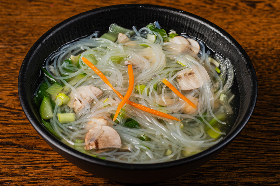 Glasnudelsuppe mit Tofu, Champignons, Frühlingszwiebeln, Pakchoi Gemüse und Koriander … 4,90 EUR