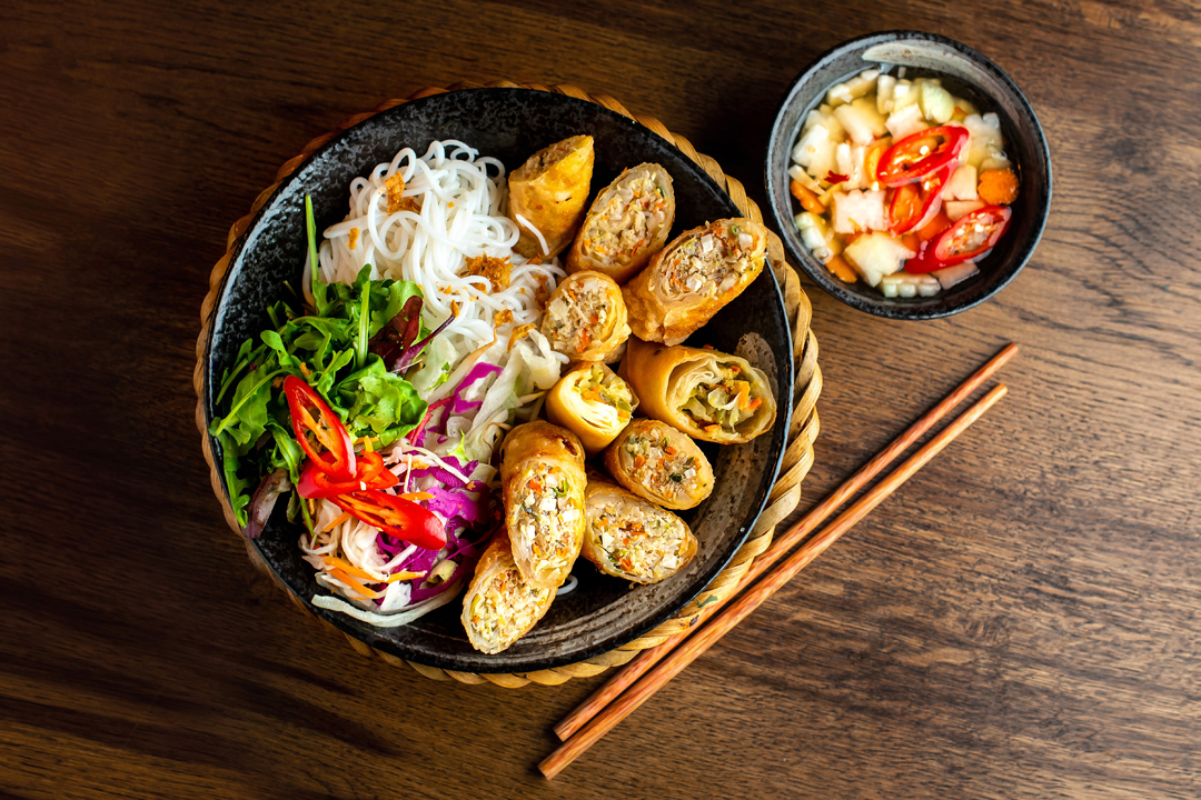 Vegetarische Frühlingsrolle auf Reisbandnudeln, frischer Salat, Kräuter und süßsaure Soße … 12,50 EUR