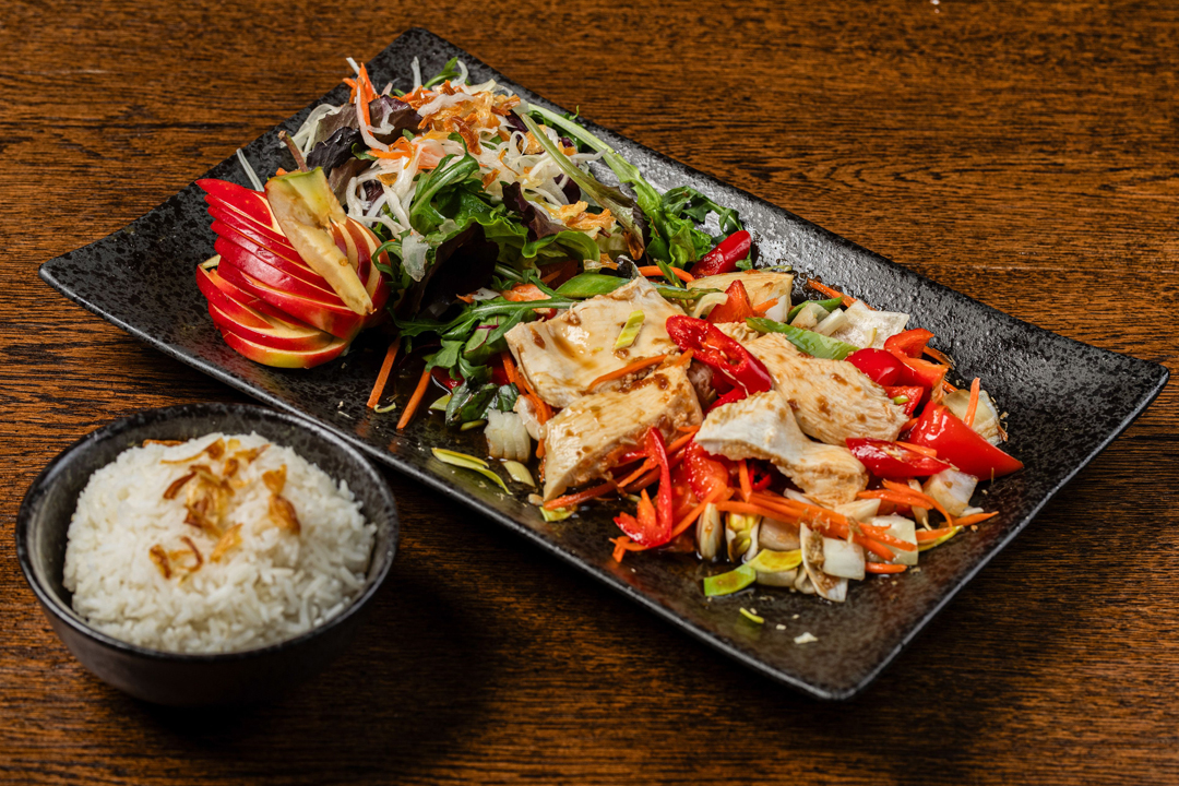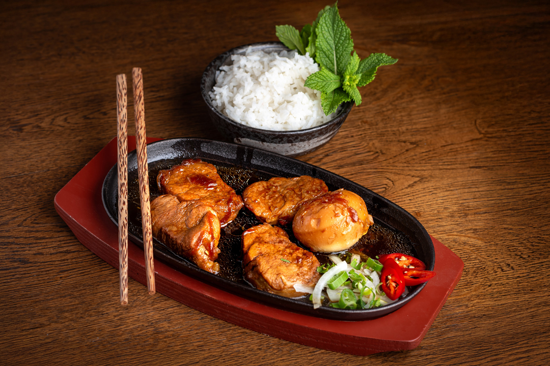 Karamellisiertes Schweinefilet mit gekochtem Ei, bunter Gartensalat, Jasminreis oder Reisnudeln … 13,90 EUR