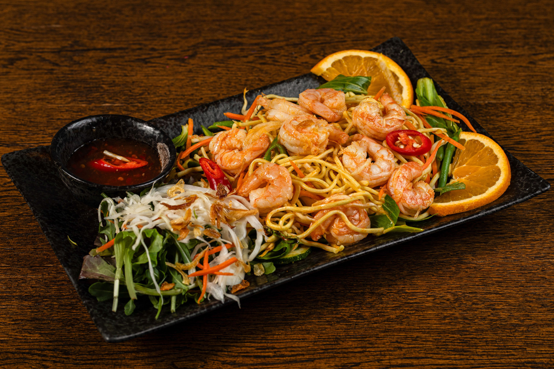 Gebratene Reisbandnudeln oder Nudeln mit Garnelen, Thaibasilikum und Koriander, Gemüse … 14,90 EUR