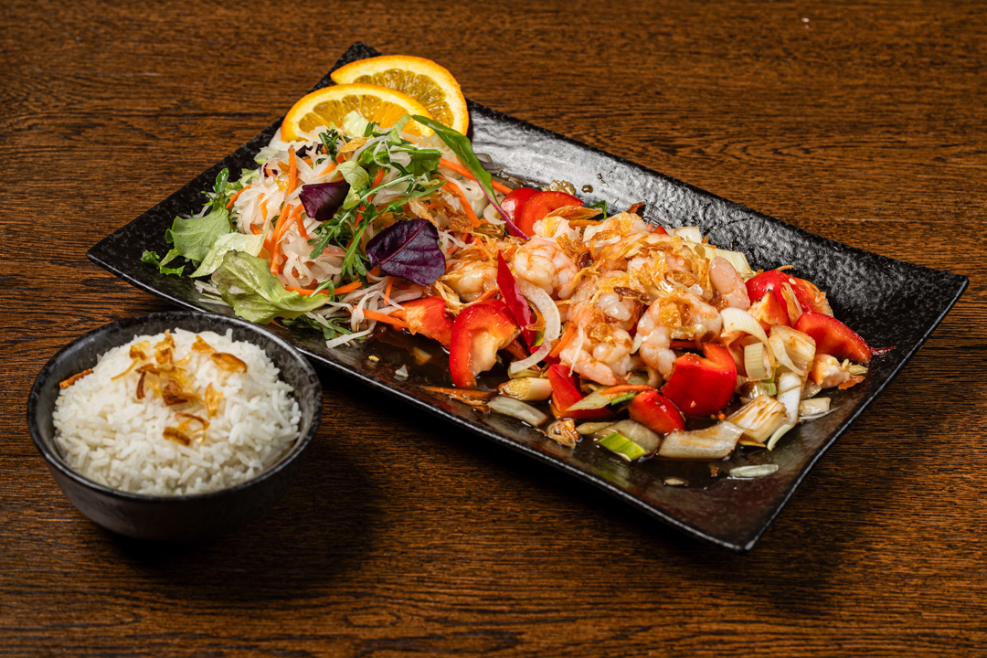 Gebratenes Garnelen mit Zitronengras, Zwiebeln, Salat, Peperoni, Paprika, Thaibasilikum und hausgemachte Soße, Reis, scharf … 14,90 EUR